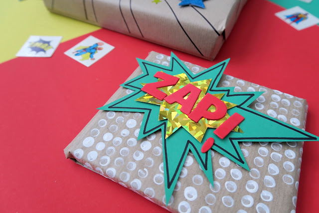 I am delighted to share a bold, more unisex fun gift wrap idea.